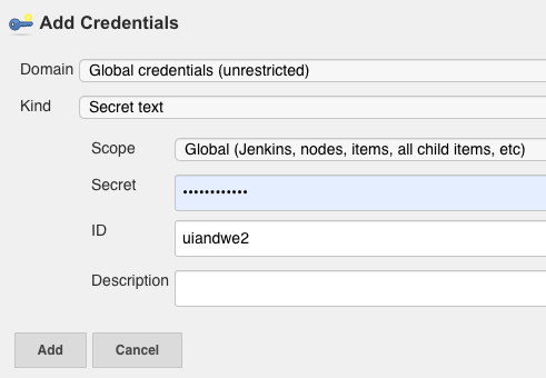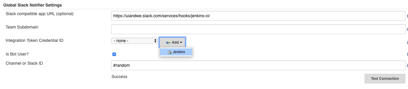 setting -> Global Slack Notifier Settings -> intergration Token Credential ID 에서 Add->*jenkins user*(사용자 이름) 클릭
