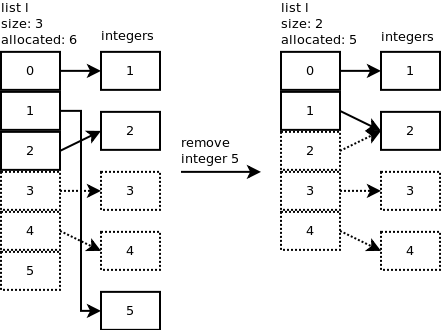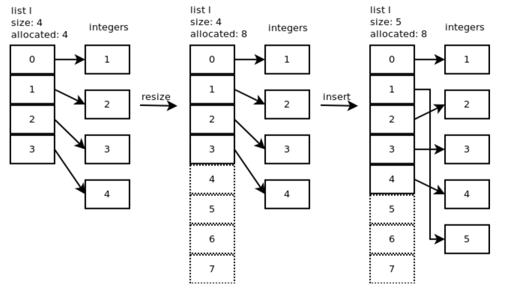 점선의 사각형은 새롭게 할당된 슬롯으로 아직 사용하지 않는 부분입니다. 8개의 슬롯이 할당되었지만, 리스트의 사이즈는 5입니다.