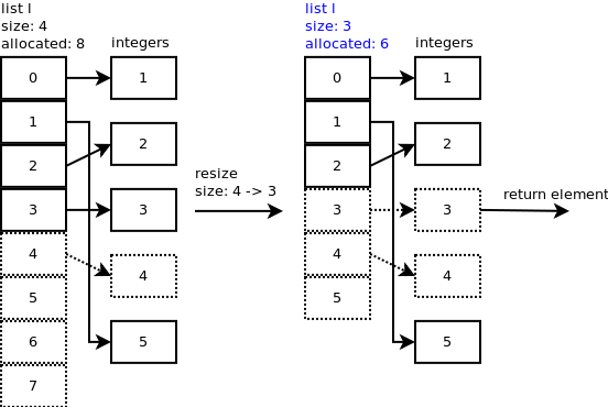 마지막 요소를 pop 할 경우 l.pop() , listpop()을 호출합니다. listpop()에서 list_resize()를 호출하며, 크기가 할당된 절반보다 작으면 list_ass_slice()를 호출하여 슬롯을 축소합니다.
