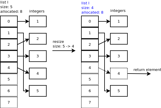 l.pop()을 통해 슬롯 4번째가 여전히 정수 4를 가리키는 걸 볼 수 있지만 중요한 것은 현재 크기가 4입니다.