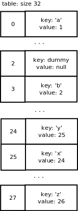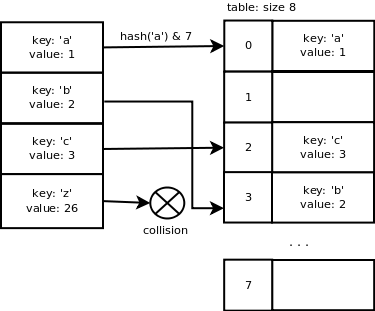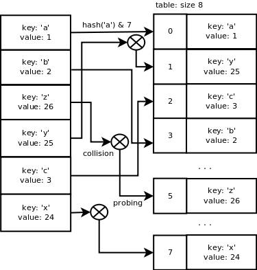 크기 x의 배열을 사용하여 키 / 값 쌍을 저장하는 경우 x-1과 같은 마스크를 사용하여 배열에서 쌍의 슬롯 인덱스를 계산합니다. 이것은 슬롯 인덱스의 계산을 빠르게 합니다. 빈 슬롯을 찾을 확률은 아래 설명된 크기 조정 메커니즘으로 인해 높습니다. 이는 대부분의 경우 간단한 계산을 하는 것이 의미가 있음을 의미합니다. 배열의 크기가 8이면 'a'에 대한 색인은 hash ( 'a') & 7 = 0입니다. 'b'에 대한 색인은 3이고 'c'에 대한 색인은 2이고 'z'는 3이며 'b'와 같습니다. 여기서 충돌이 있습니다.