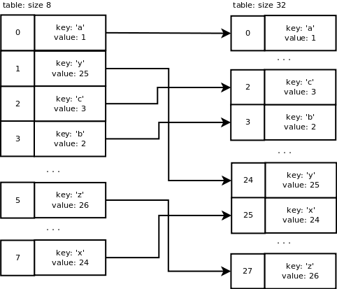 이것은 크기 조정 중 테이블에서 발생하는 것입니다. 크기가 32 인 새 테이블이 할당됩니다. 기존 테이블 항목은 새 마스크 값인 31을 사용하여 새 테이블에 삽입됩니다. 다음과 같이 끝납니다.