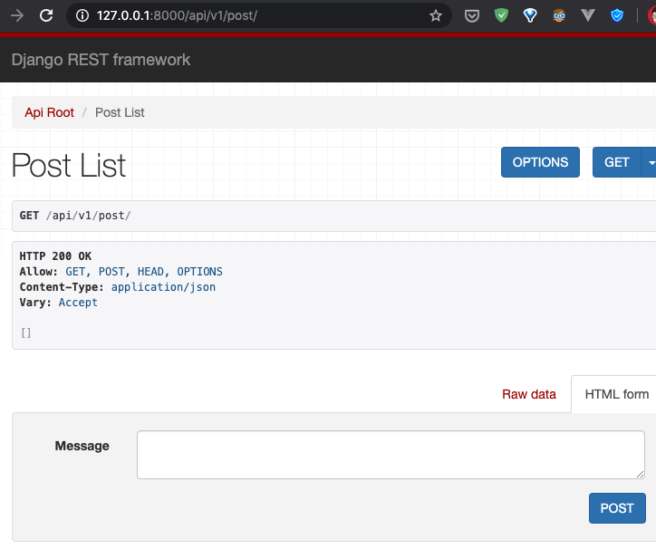 127.0.0.1:8000/api/v1/post/ 링크로 들어가보면 아래와 같이 DRF의 템플릿이 나옵니다.