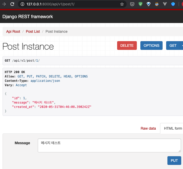 127.0.0.1:8000/api/v1/post/1/ 으로 들어가보면 해당 인스턴스의 내용과 수정/삭제를 할수 잇는것을 알수 있습니다.