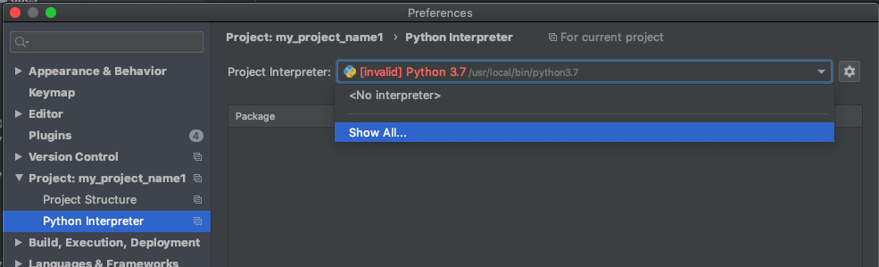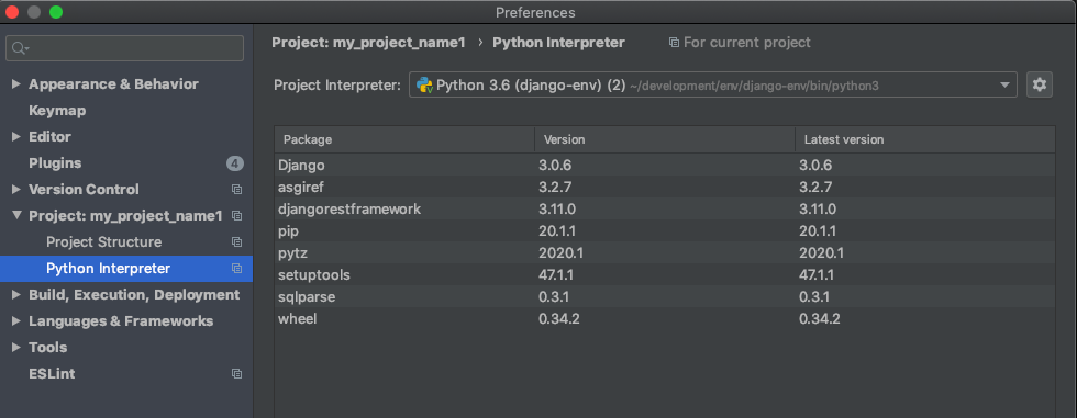 메뉴 중에서 preferences -> project -> python interpreter에서 위에서 생성한 env를 설정해 줍니다.