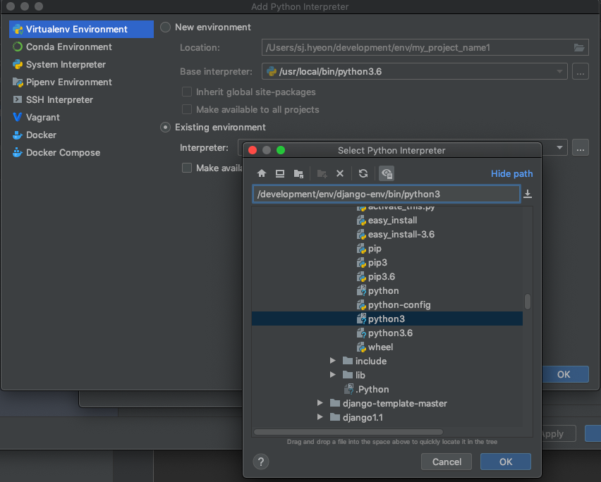 Virtualenv Environment -> Existing environment 선택, interpreter 에서 경로를 위에서 만든 env의 경로중 /bin/python3를 선택하고 ok를 눌러주면 설정이 완료 됩니다.
