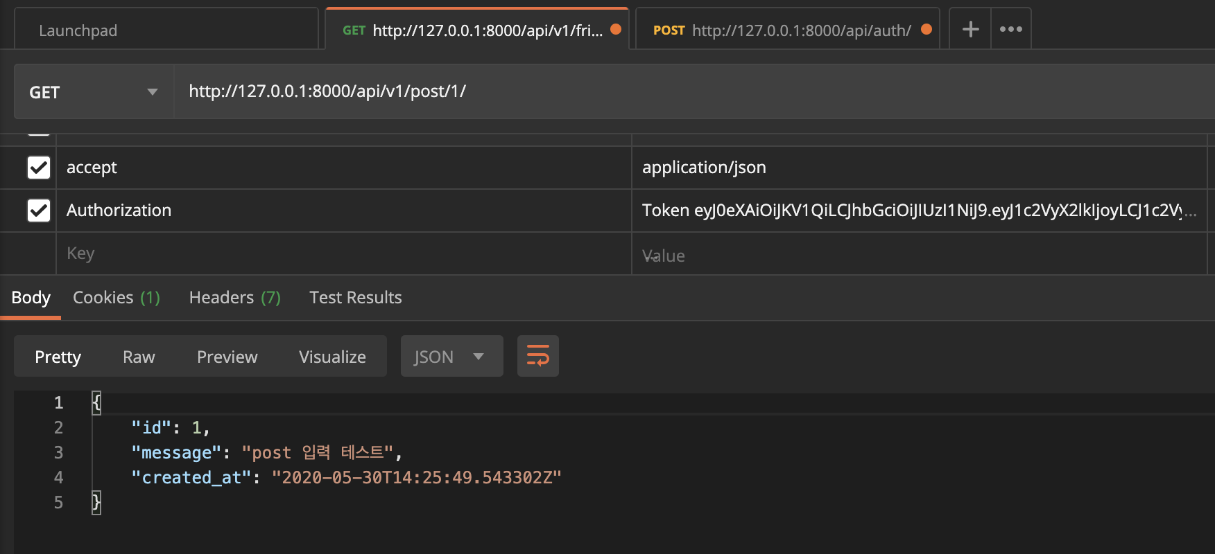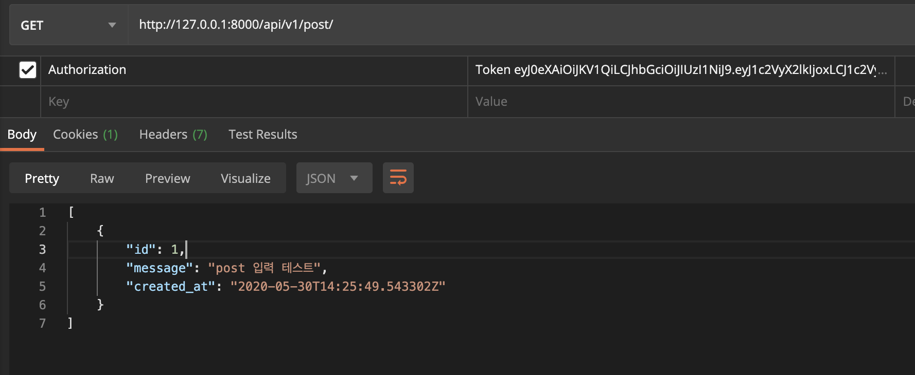 1편에서 만들었던 http://127.0.0.1:8000/api/v1/post/ 에 GET을 호출해 보면 데이터를 확인할 수 있습니다.