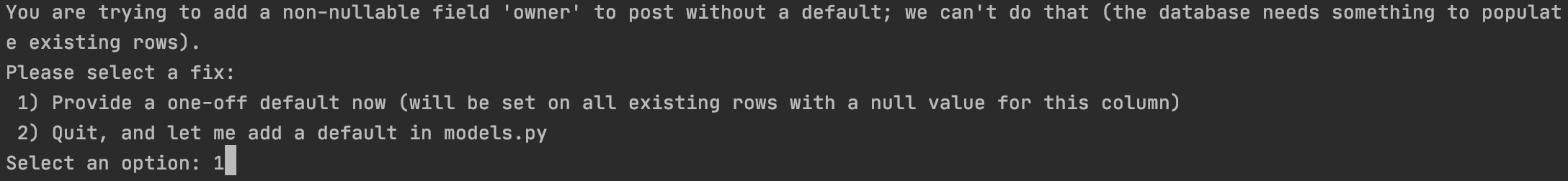 이럴 땐 필드의 속성에 null=True를 추가해주거나 필드의 default 값을 설정해주면 된다.
