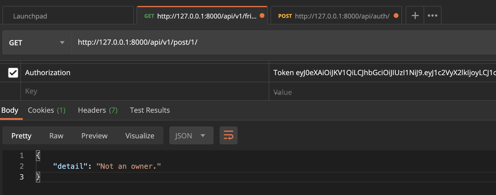 이제 test 유저의 토큰 값을 세팅하여 같은 url로 접근하면 아래와 같이 에러 메시지가 나오는 것을 볼 수 있습니다.