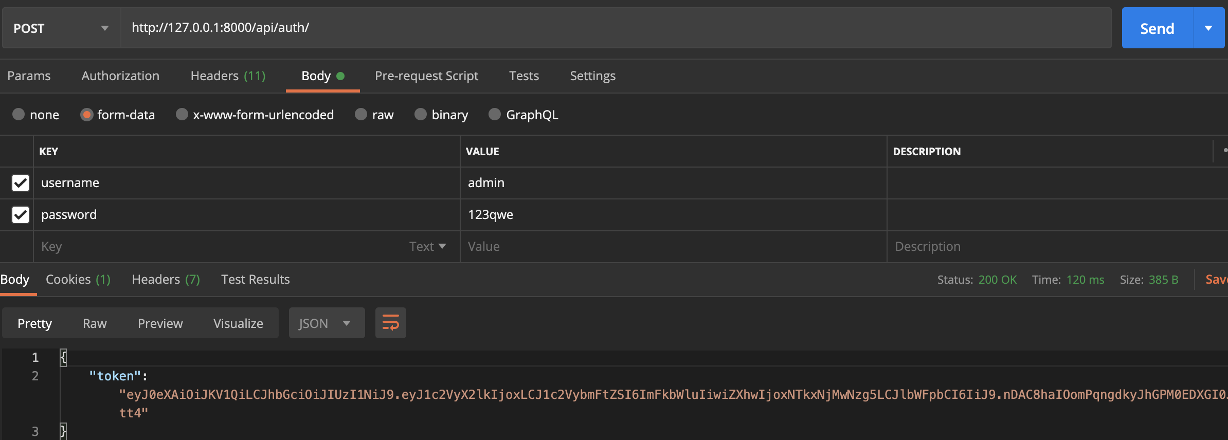 body탭에서 form-data 형식으로 파라미터와 값을 넣어준 후 전송해 보면 정상적으로 token이 발행된 것을 확인할 수 있습니다.
