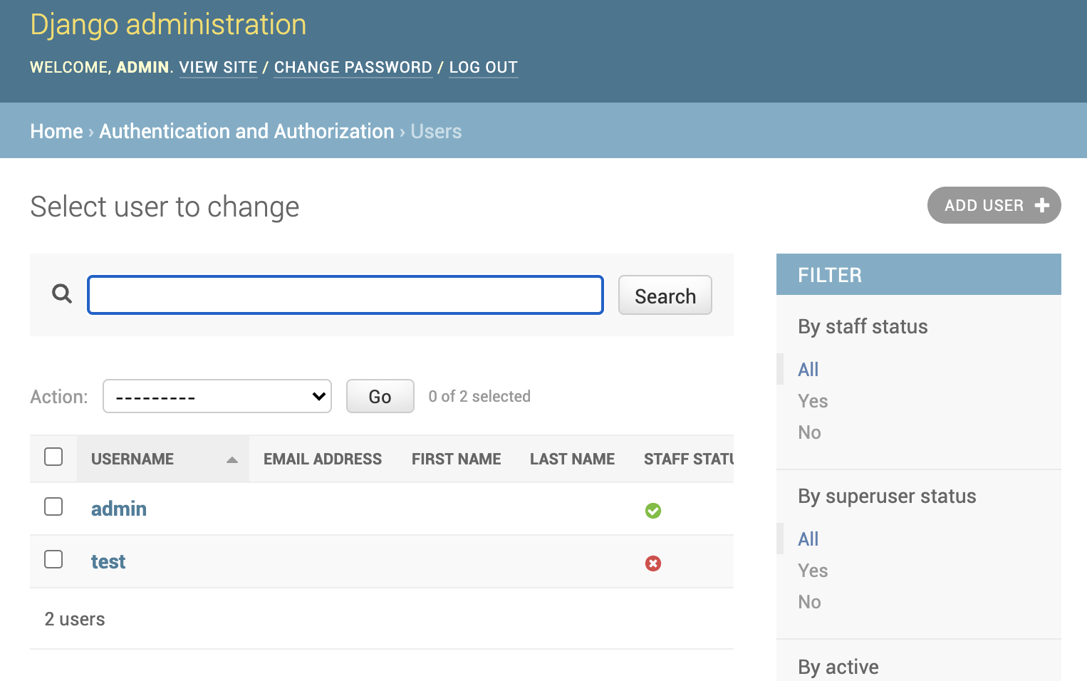 127.0.0.1:8000/admin으로 접속하여 새로운 계정을 추가해줍니다. (저의 경우 test라 이름을 지었습니다.)