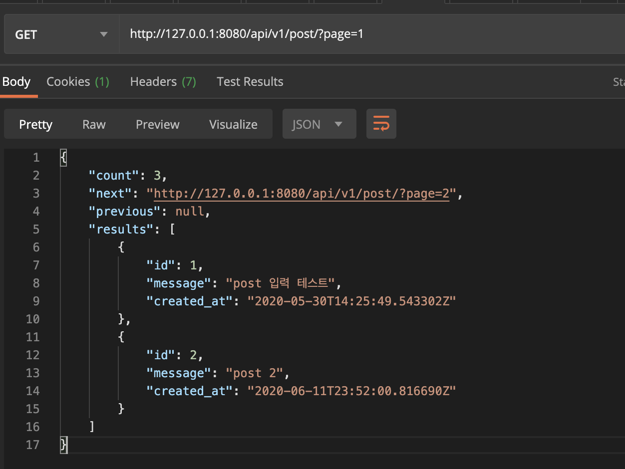 리턴 값에서 count는 전체 객체의 숫자를 뜻하며, next / previous는 다음/이전 페이지의 링크를 전달해 줍니다.