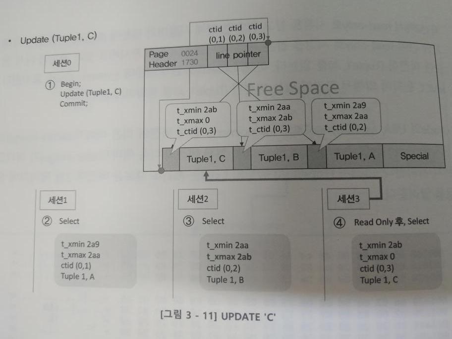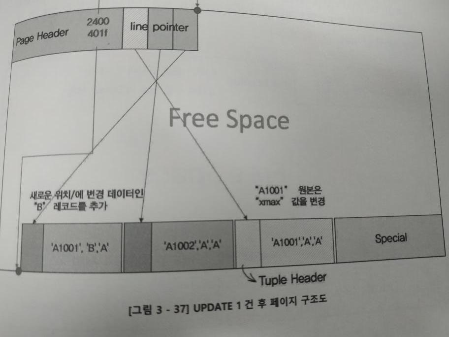 postgreSQL는 Multi Generation Architecture이다. 이는 update 작업이 발생 시 페이지의 이전 레코드를 overwrite 하는 대신 새로운 레코드를 만드는 구조이다.