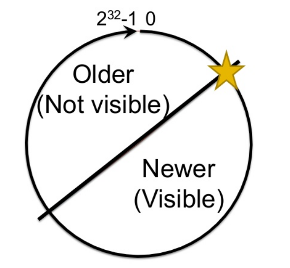 XID가 100인 시점에서 어떤 트랜잭션이 발생했다고 가정하자. XID가 100 시점에는 보이겠지만, 100 시점의 대칭점보다 작은 XID 시점에 왔을 때는 100에서 발생한 트랜잭션의 데이터가 보인다.(두 번째 스텝) 하지만 대칭점보다 큰 XID의 시점에서는 보이지 않는다. (세 번째 ) 대칭점이 이동하여 newer와 older의 위치가 변경되기 때문이다.