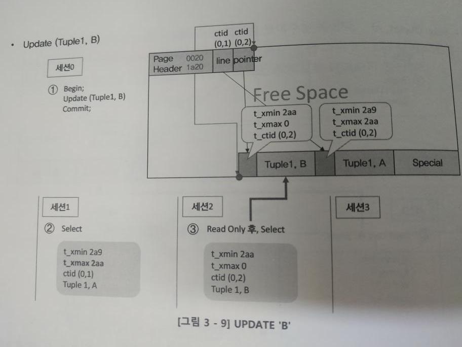- 세션 2에서 read-only로 시점을 잡는다면, (tuple1, B)를 읽을 수 있다. 하지만 세션 1에서는 SCN을 보존시키고 있기 때문에 여전히 (tuple1, A)를 읽을 수 있다. ( t_xmax의 값에 따라 읽을수 있다. )