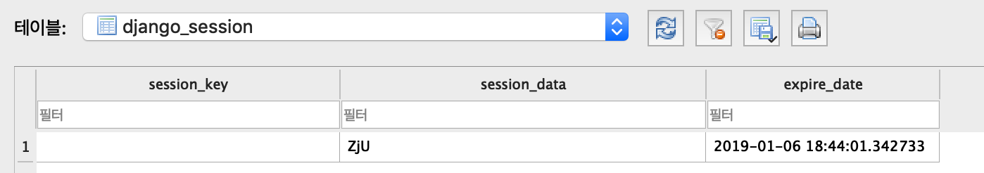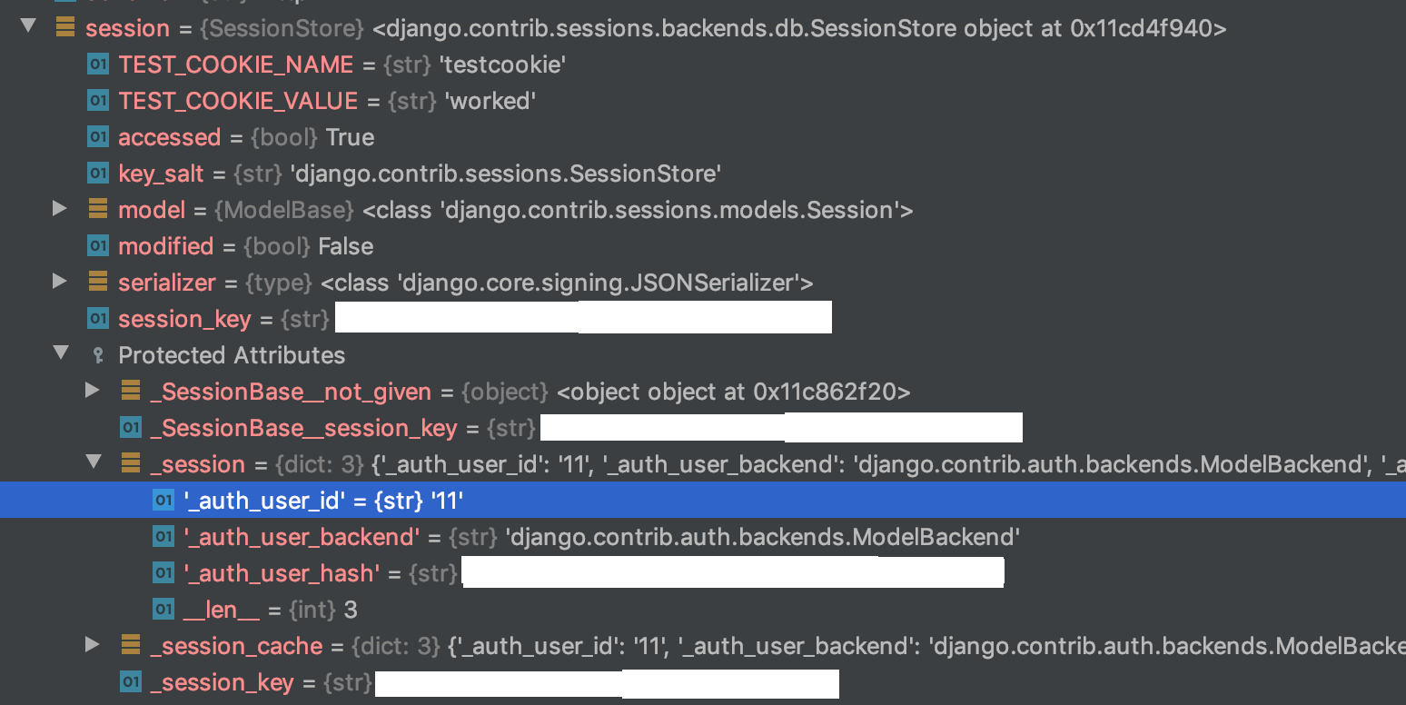 middleware → sessionStore 에서 request._session 값을 세팅을 합니다. 아래 이미지는 session값을 통해 _auth_user_id를 세팅한 결과입니다.