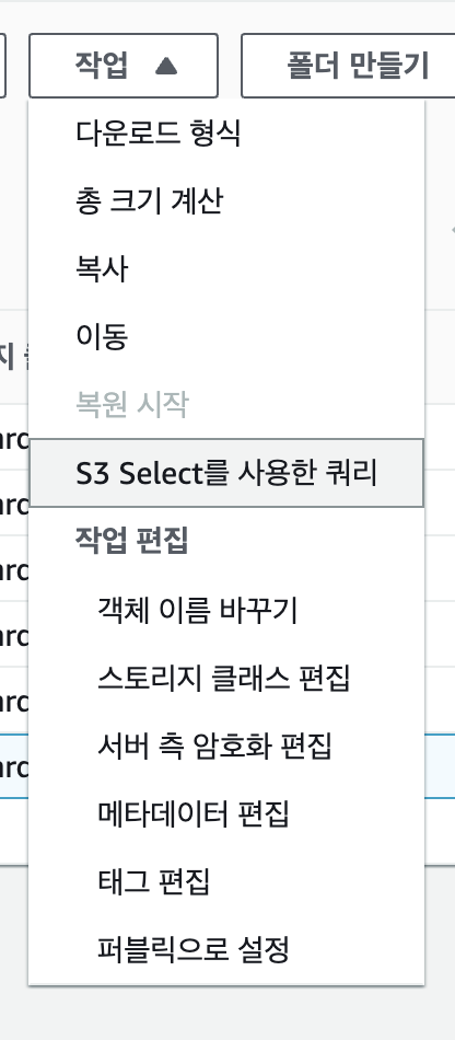 작업 → s3 select 쿼리를 선택