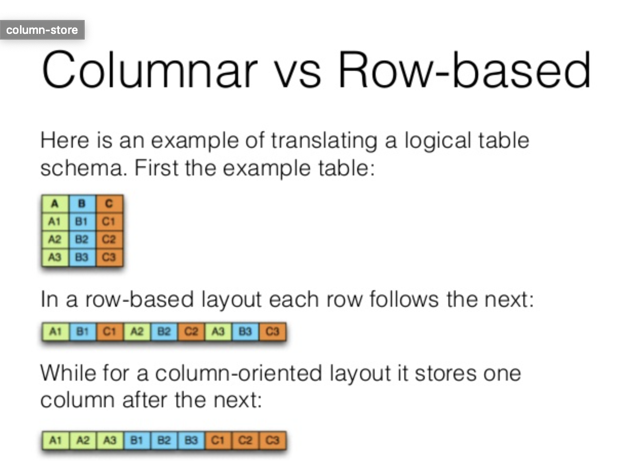 컬럼 지향 데이터베이스는 데이터를 칼럼 단위로 묶어서 저장한다. 그런 다음 이 칼럼 값은 디스크 상에 연속적으로 저장된다. 이 방식은 전통적인 파일의 전체 로우가 연속적으로 저장되는 일반적인 로우 지향형 접근방식과 다르다.