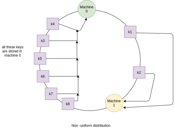 대부분의 키가 단일 시스템 또는 단일 서버 근처에 해시되었을 때 (데이터 쏠림) 하나의 서버가 다른 모든 서버에 비해 더 많은 키를 가지고 있기 때문에 이상적이지 않다.