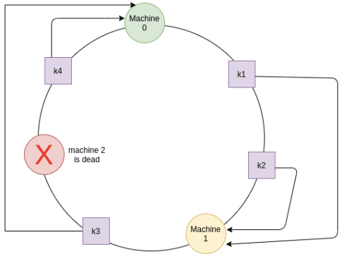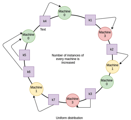 이 문제를 극복하기 위해 가상의 복제본 서버를 도입한다.(아래의 그림에서 machine0의 대수가 세대, machine 1은ㅇ 두대, machine3은 두대가 되었다) 복제본 서버(vnode라고 부른다)를 도입하고 서버의 각 복제본은 다른 값으로 해시된다. 즉, 더 많은 머신이 임의의 위치에 링에 배치됨을 의미한다. 이러한 복제본의 수가 증가함에 따라 배포는 점점 더 균일해진다.