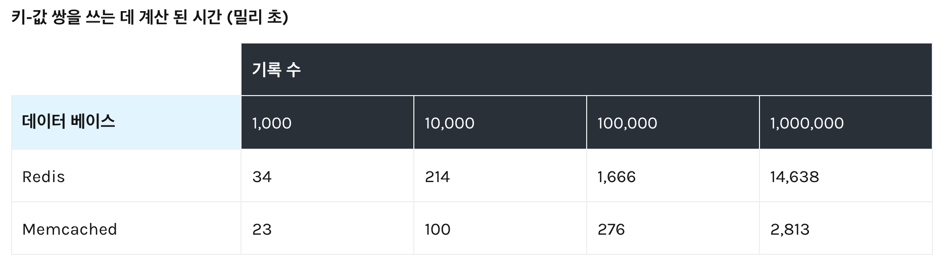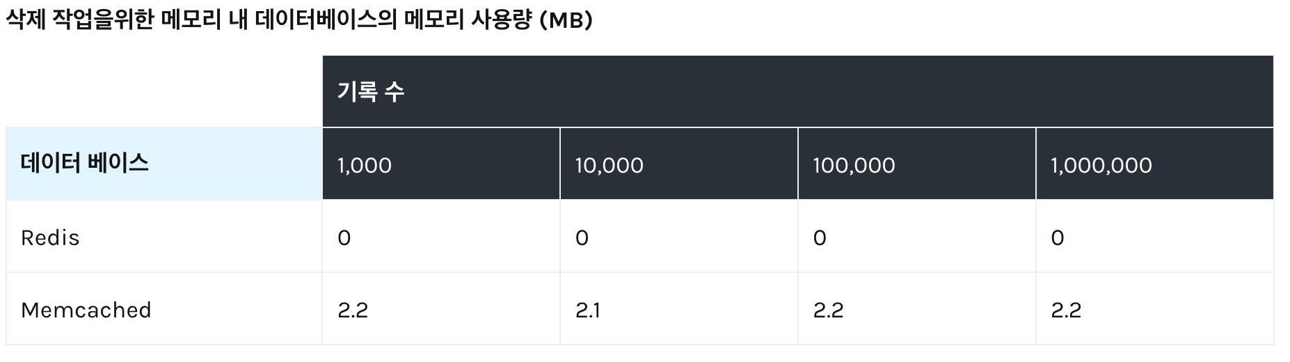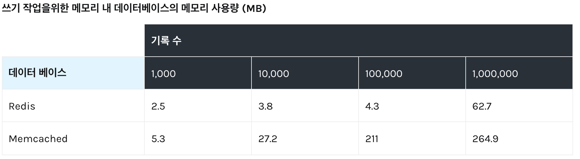 - Memcached는 정적인 데이터 저장에 유리하다. Redis는 Copy-on-Write 방식을 사용하기 때문에 실제 사용하는 메모리보다 더 많은 메모리를 요구한다.