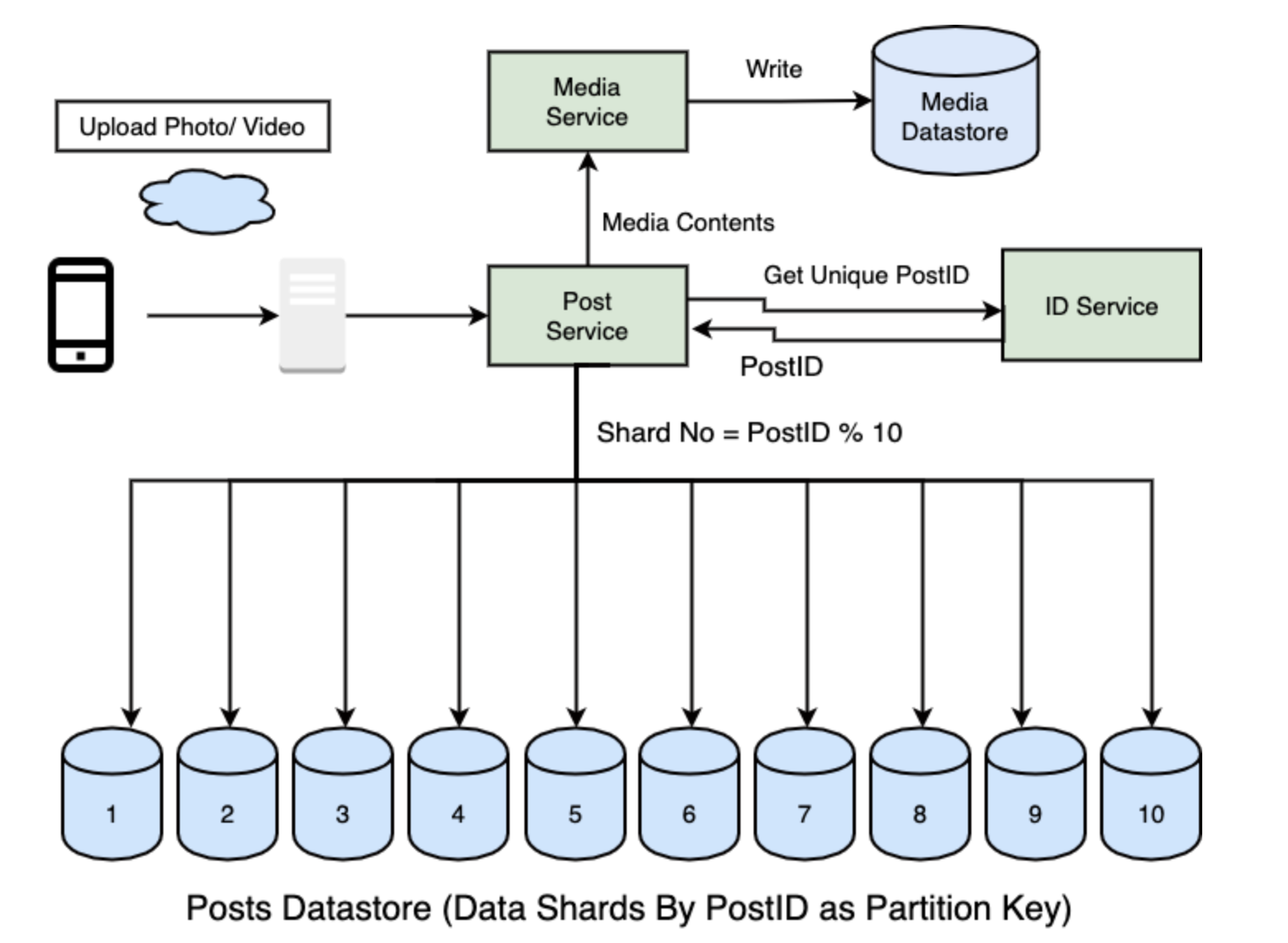 따라서 UserID % 10으로 샤드 번호를 찾은 해당 디비에 데이터를 저장. 시스템에서 모든 사진을 고유하게 식별하기 위해 각 PhotoID와 함께 샤드 번호를 추가