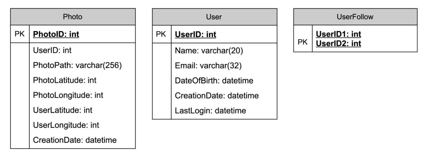 Photo 테이블은 사진과 관련된 모든 데이터를 저장한다. 최근 사진을 먼저 가져와야 하므로 (PhotoID, CreationDate)에 대한 인덱스가 필요하다