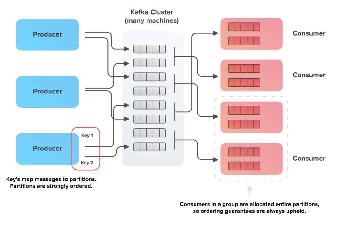 Kafka는 이 문제에 대한 확장 가능한 설루션을 제공한다.. 특정 파티션에 대한 키의 일관된 해싱으로 병렬 처리를 허용하는 항목에 대해 파티션을 지정할 수 있다. 동일한 키를 가진 문서는 항상 동일한 파티션으로 전송되며 소비자는 경쟁을 피하기 위해 사용 중인 파티션에 대한 잠금을 획득할 수 있다.