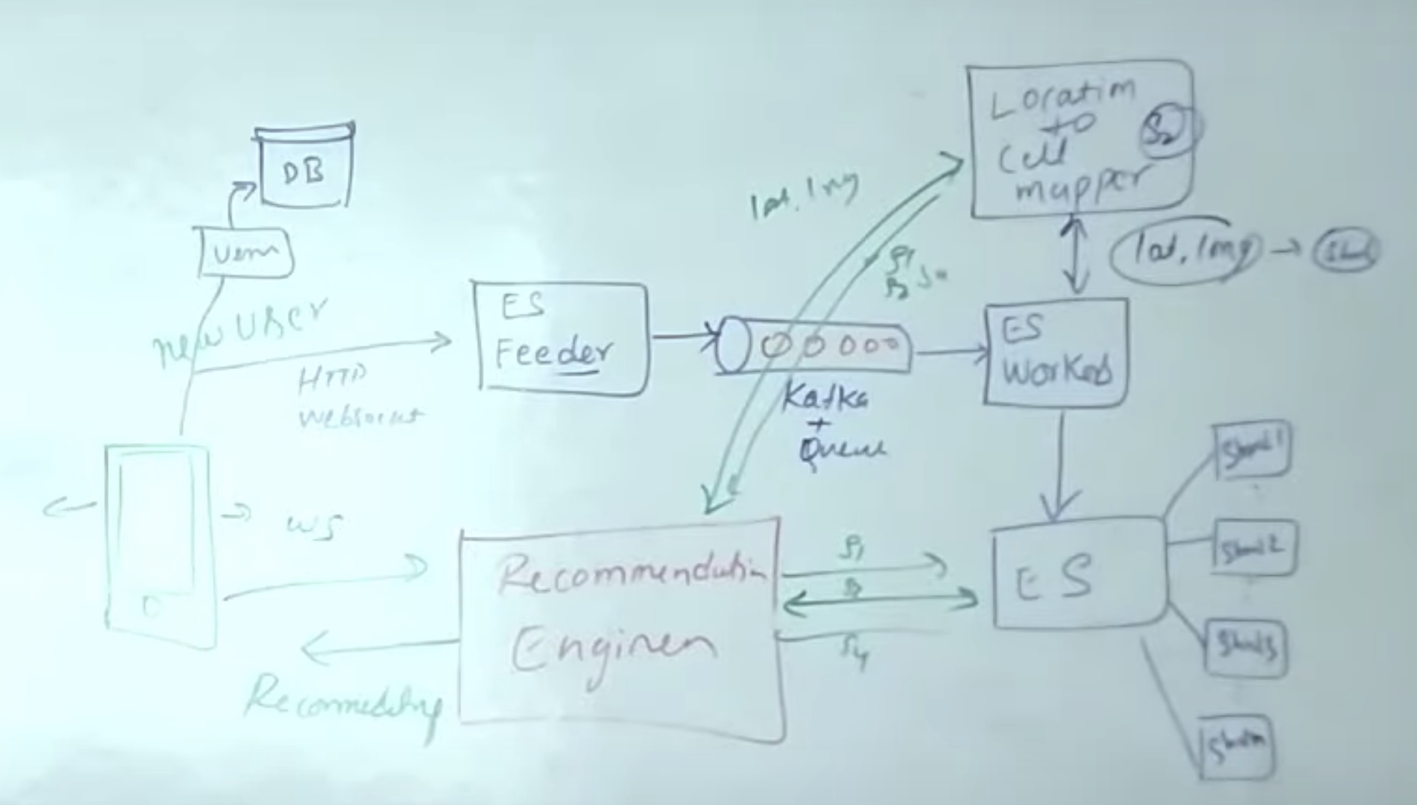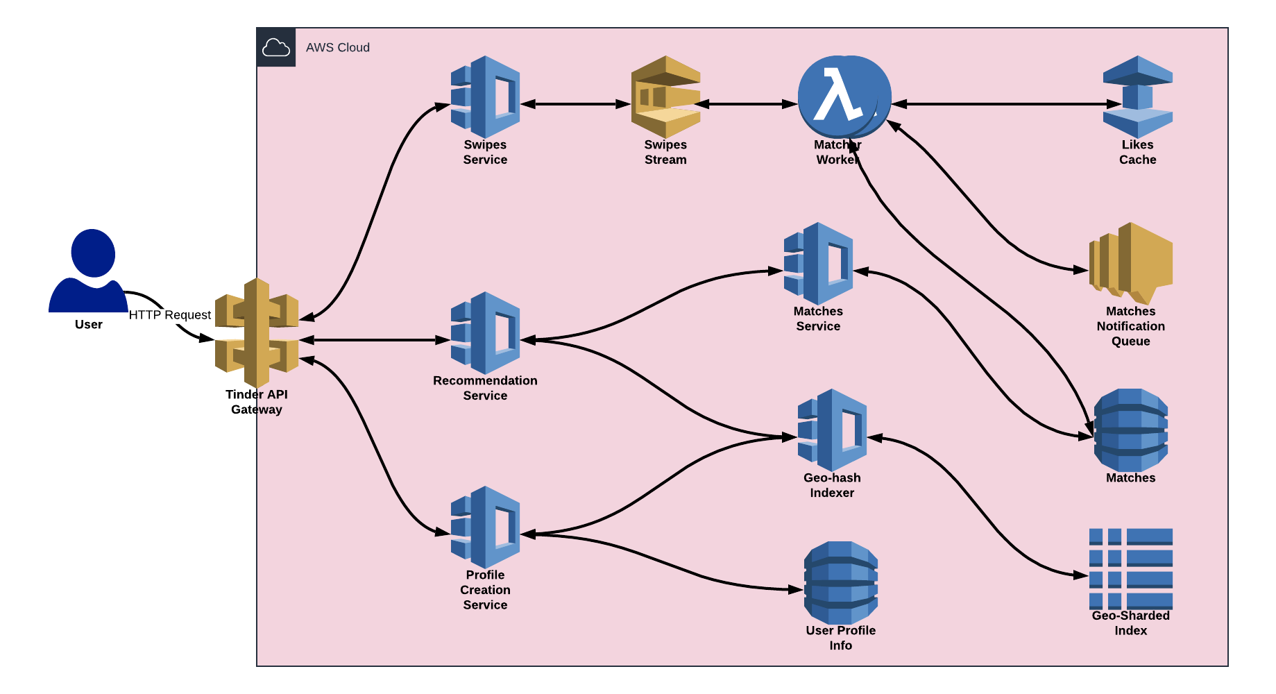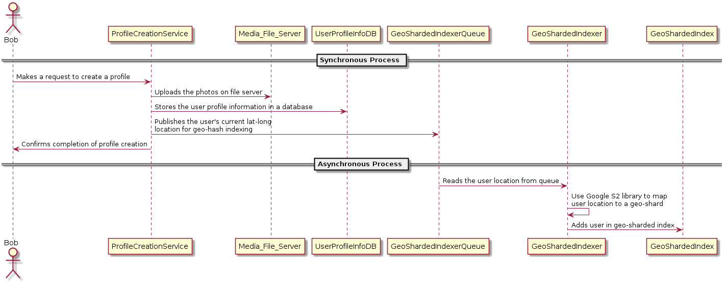 사용자 미디어(예: 사진)는 파일 서버에 업로드되고 사용자 위치를 포함한 사용자 정보는 Amazon DynamoDB와 같은 key-value로 저장된다. 유저의 데이터는 지역 분할 인덱스(5.GeoShard)에 사용자를 추천하기 위한 대기열에 추가된다.