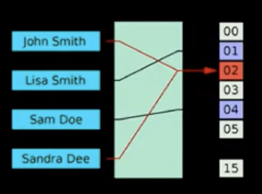 보통은 충돌을 피하기 위해 chaining(링크드리스트) 이나 liner probing(다음번 빈 곳에 저장)