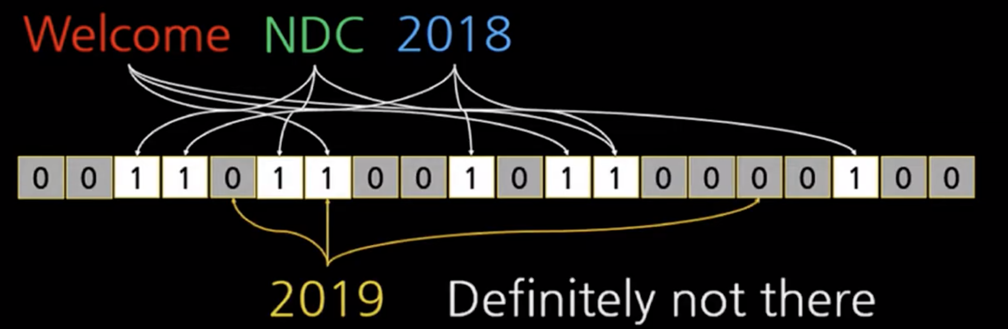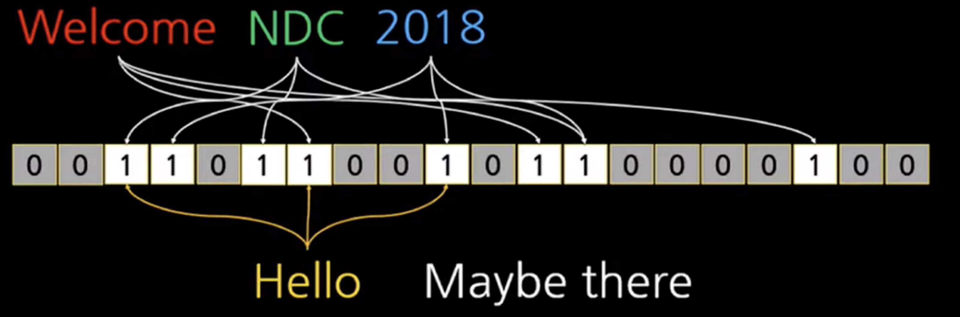여기에서 "2019"가 있어요?라고 질의해보면 2019에 해당하는 비트가 0인 곳이 있으므로 2019는 저장되지 않음(100% 확신할 수 있기 때문에)