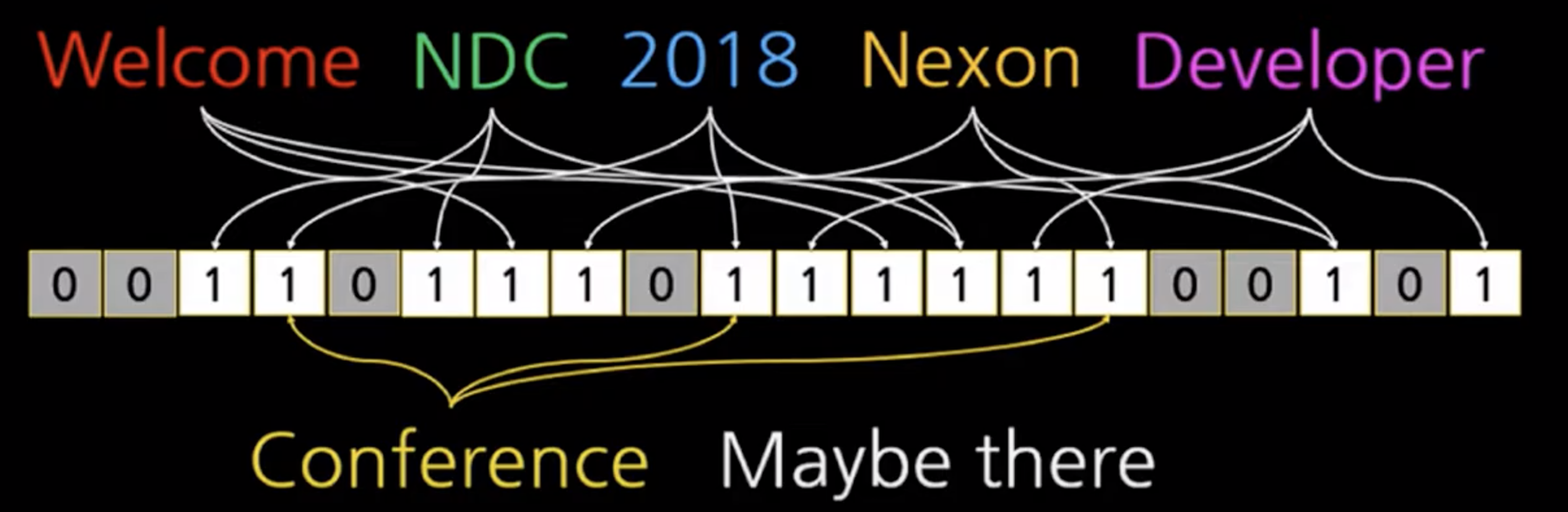 또한 데이터가 많이 들어갈수록 많은 비트가 1이 되므로, 충돌이 많이 발생하게 된다. (conference는 없지만 1로 되어 있다)