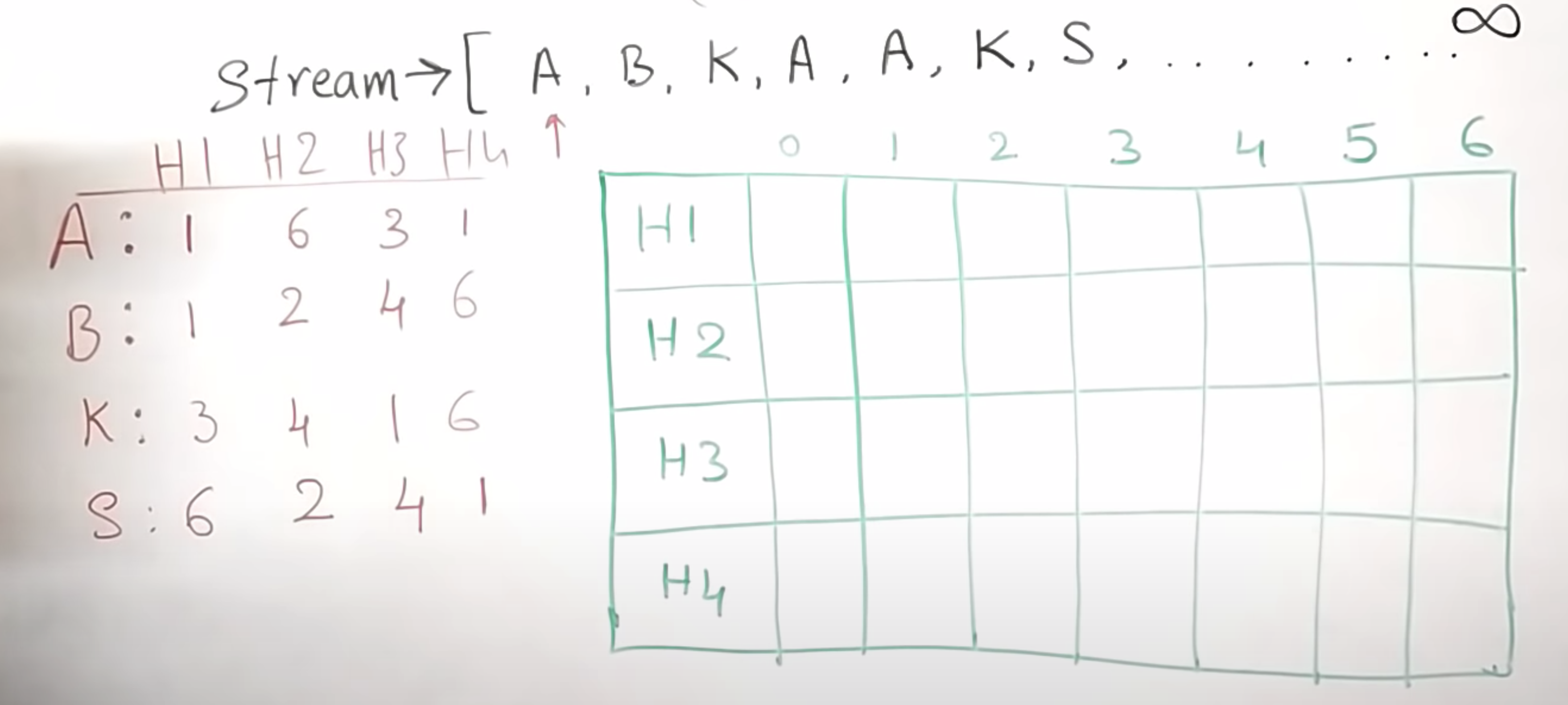 그리고 4개의 해시 함수를 이용해서 이미 알파벳의 테이블이 만들어져 있다. (왼쪽 빨간색)