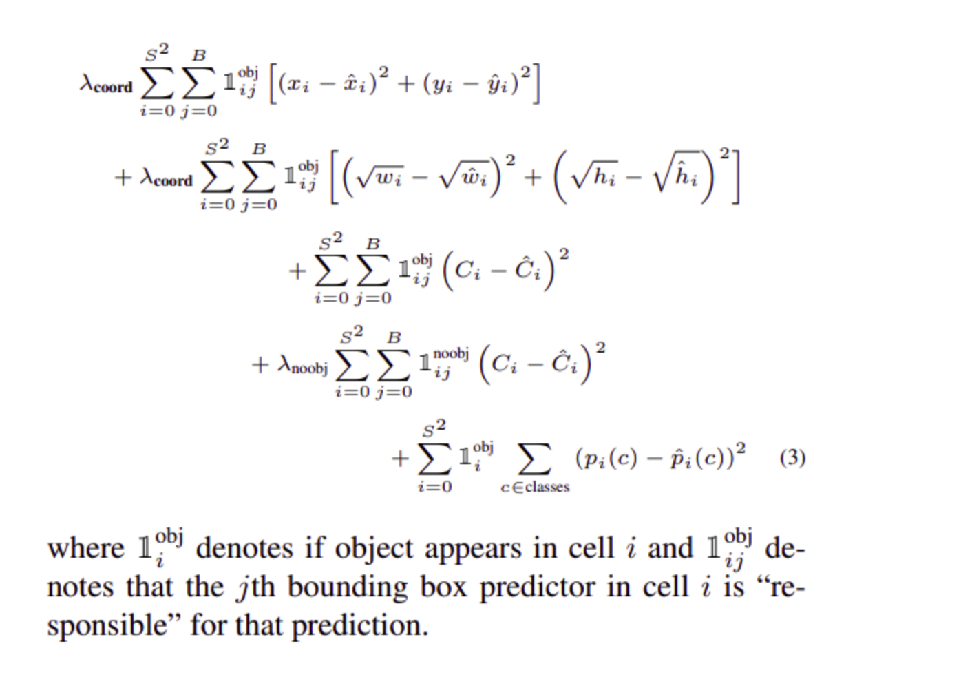 “responsible” 이라는 개념은 그리드 셀에 대해서도, 바운딩 박스에 대해서도 쓰입니다. 하지만 로스의 관점에서 “responsible” 은 결국 바운딩 박스에 대한 개념으로 생각하면 됩니다. 즉 하나의 물체에 대한 예측을 책임지는 유일한 바운딩 박스를 결정하는 문제입니다. 수식을 보면 예측에 대해 “responsible” 하지 않은 박스의 좌표 크기 로스 텀은 0이 되는 것을 알 수 있습니다. 즉 책임이 없는 박스들에 대해서는 좌표와 크기의 로스를 면제해주자는 아이디어입니다.