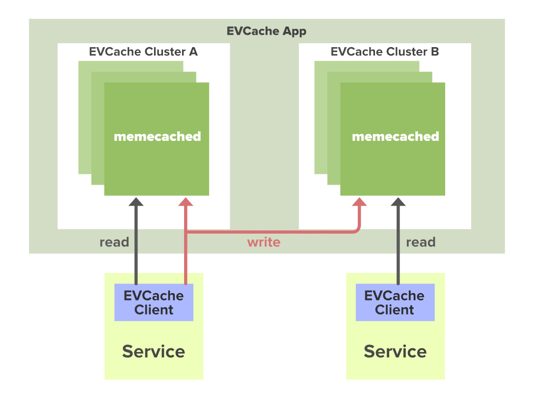 Netflix는 여러 AWS EC2 인스턴스에 많은 클러스터를 배포했으며 이러한 클러스터에는 Memcached의 캐시 클라이언트도 있습니다. 데이터는 동일한 영역 내의 클러스터에서 공유되며 여러 캐시 복사본이 샤딩된 노드에 저장됩니다. 클라이언트에 쓰기가 발생할 때마다 모든 클러스터의 모든 노드가 업데이트되지만 캐시에 읽기가 발생하면 가장 가까운 클러스터(모든 클러스터 및 노드가 아님)와 해당 노드에만 전송됩니다. 노드를 사용할 수 없는 경우 다른 사용 가능한 노드에서 읽습니다. 이 접근 방식은 성능, 가용성 및 안정성을 향상합니다.