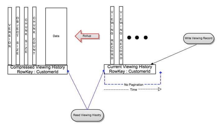 - 압축된 시청 기록(CompressedVH): 데이터가 업데이트된다면 오래된 시청 기록 데이터는 저장 공간을 줄이기 위해 압축됩니다. 압축된 시청 기록은 행당 단일 열에 저장됩니다.