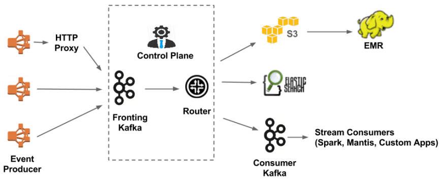 EMR/S3에 이벤트를 업로드하기 위해 Chukwa는 Kafka(실시간 데이터 처리의 메인 게이트)에 대한 트래픽도 제공합니다. Kafka에서 다양한 싱크(S3, Elasticsearch 및 버퍼)로 데이터를 이동하는 일을 담당합니다. 이러한 메시지의 라우팅은 Apache Samja 프레임워크를 사용하여 수행됩니다.