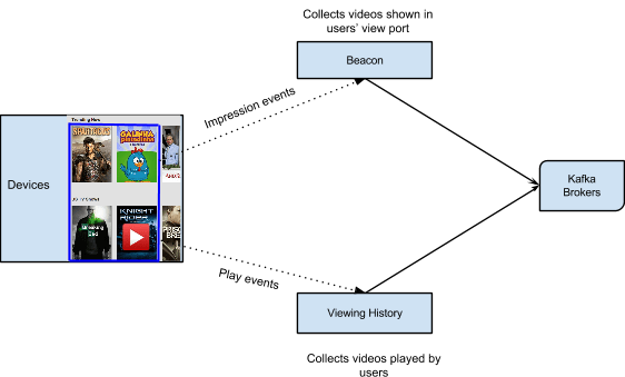 시청기록 서비스는 회원이 재생한 모든 동영상을 캡처합니다. Beacon은 Netflix 내의 모든 노출 이벤트 및 사용자 활동을 캡처하는 서비스입니다. Viewing History 및 Beacon 서비스에서 수집한 모든 데이터는 Kafka로 전송됩니다.