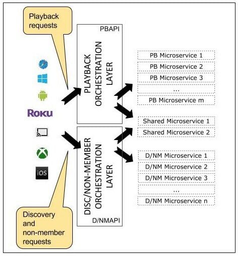 이미 가입한 사용자의 예를 고려한다면. 사용자가 최신 에피소드에 대해 재생을 클릭한다고 가정하면 요청이 재생 API로 라우팅 되고 API는 차례로 내부에서 여러 마이크로 서비스를 호출합니다. 이러한 호출 중 일부는 서로 의존하지 않기 때문에 병렬로 수행될 수 있습니다. API에는 필요에 따라 호출을 시퀀싱 하고 병렬화하는 모든 로직이 포함되어 있습니다. 그러면 장치는 고객이 "재생"을 클릭할 때 내부적으로 진행되는 오케스트레이션에 대해 아무것도 알 필요가 없습니다.