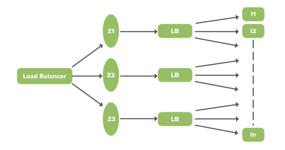 Netflix는 Amazon의 Elastic Load Balancer(ELB) 서비스를 사용하여 트래픽을 서비스로 라우팅 합니다. ELB는 로드가 먼저 영역 간에 균형을 맞춘 다음 인스턴스에 분산되도록 설정됩니다.