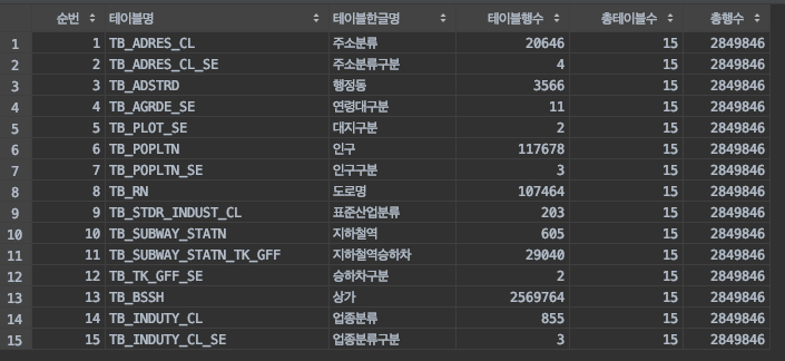 SELECT TRIM('TB_POPLTN_SE') AS TABLE_NAME, COUNT(*) DATA_CNT FROM SQLD.TB_POPLTN_SE