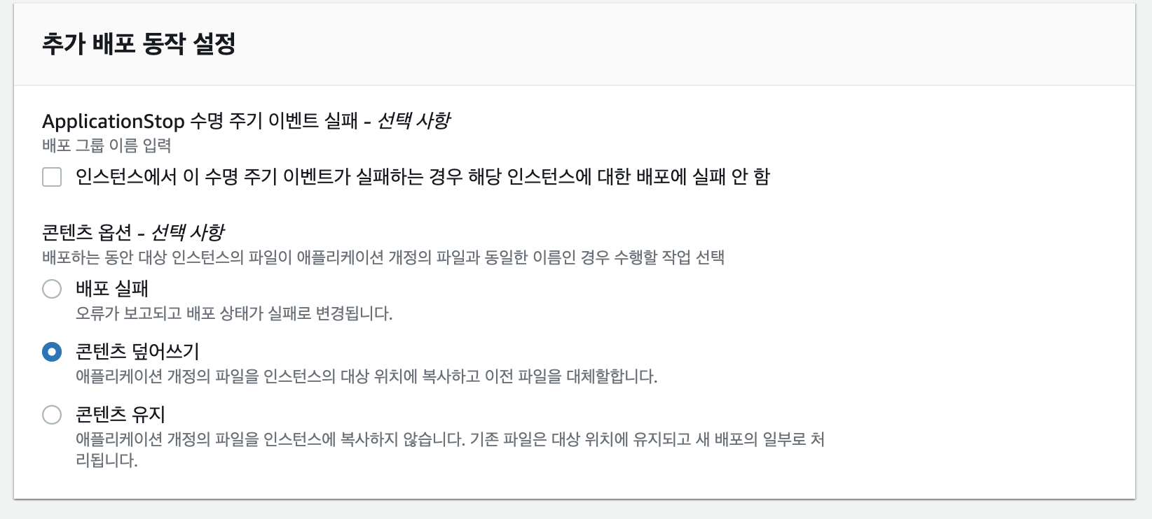 3. 마지막으로 옵션사항엔 ( 나의 경우엔 ) 콘텐츠 덮어쓰기로 항상 덮어쓰게 만들어준다.