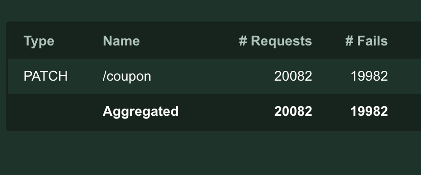 해당 테스트는 locust로 진행했다. 2만 번의 요청 중에서 딱 100개를 빼고 모두 실패(400)가 되었다!( 성공 )