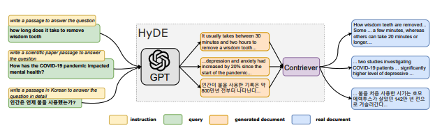 고밀도 검색은 여러 작업과 언어에서 효과적이고 효율적인 것으로 나타났지만, 관련성 레이블이 없는 경우 검색 시스템을 구축하는 것은 여전히 어렵습니다. Hypothetical Document Embeddings(HyDE)을 통해 피벗할 것을 제안합니다. 쿼리가 주어지면 HyDE는 먼저 제로 샷으로 명령어 추종 언어 모델에 가상의 문서를 생성하도록 지시합니다.