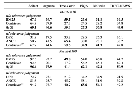 결론 요약 : LLM에게 가상 문서(응답)를 생성하도록 지시한 후 이를 사용하여 유사한 문서를 찾으면 zero-shot dense retrieval 에서 검색 성능이 향상됩니다.