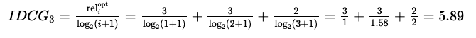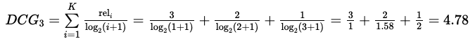 위의 이미지를 최상위 값들은 3, 3, 2 순으로 된다. 그리고 분모에는 DCG와 마찬가지로 log값이 취해진다.