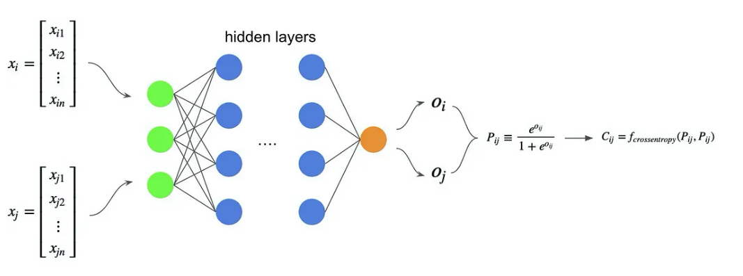 모델은 두 URL 쌍의 출력을 학습한 확률로 매핑하여 시그모이드 함수로 이를 연결한다. (pair-wise이므로 입력은 2개 출력도 두개)