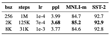 큰 batch로 training을 진행하는 것이 MLM을 위한 복잡도 뿐만 아니라 end-task의 정확도를 향상시킨다는 것을 알 수 있다