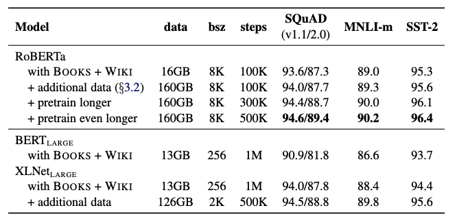 하이퍼파미터 튜닝과 훈련 세트 크기의 효과에 대한 면밀한 평가가 포함된 BERT 사전 훈련를 발표합니다. 그 결과, BERT의 훈련이 상당히 부족하다는 사실을 발견하고 모든 BERT 이후 방법의 성능과 비슷하거나 능가할 수 있는 개선된 BERT 모델 훈련 레시피(RoBERTa)를 제안했습니다.