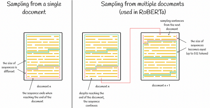 NSP(Next Sentence Prediction) : 기존 BERT의 pretrain 절차에서 모델은 동일한 문서에서 연속적으로 샘플링되거나(p = 0.5) 서로 다른 문서에서 샘플링된 두 개의 연결된 문서 세그먼트를 관찰합니다. 세그먼트가 동일한 문서에서 나온 것인지 아니면 별개의 문서에서 나온 것인지 예측하도록 훈련됩니다.